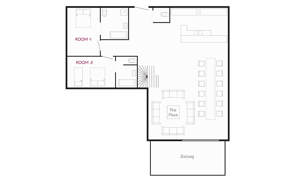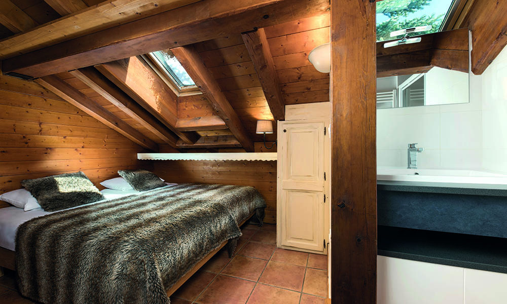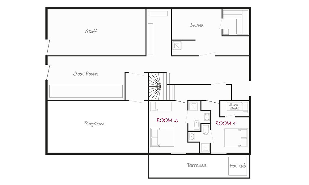 The ground floor houses two rooms (for one or two families), the playroom, the sauna and the ski room. The first floor has the spacious public areas with large windows overlooking the piste and mountain and a door onto the terrace where you’ll find the hot tub. The fireplace is the centrepiece of the lounge and there are two bedrooms to be shared by one family (both have their own ensuite, naturally).