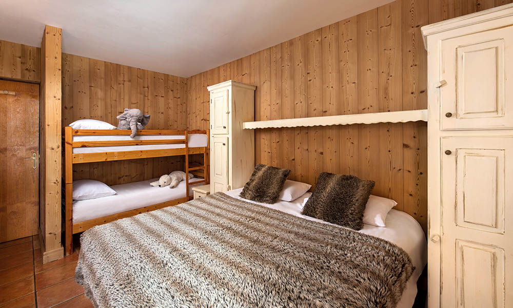 Sleeps up to 4. This room has a twin bed with a set of bunks and an ensuite with a shower. It also benefits from access to a shared terrace next to the piste.