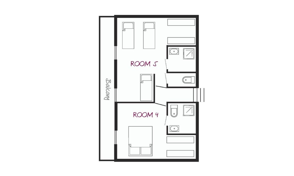 Sleeps up to 3 plus space for cots. This spacious room on the top floor has three single beds, a large walk-in wardrobe and an ensuite with a shower and separate toilet. The room shares a long balcony with Room 4 and can be booked with this room for families of up to 5.