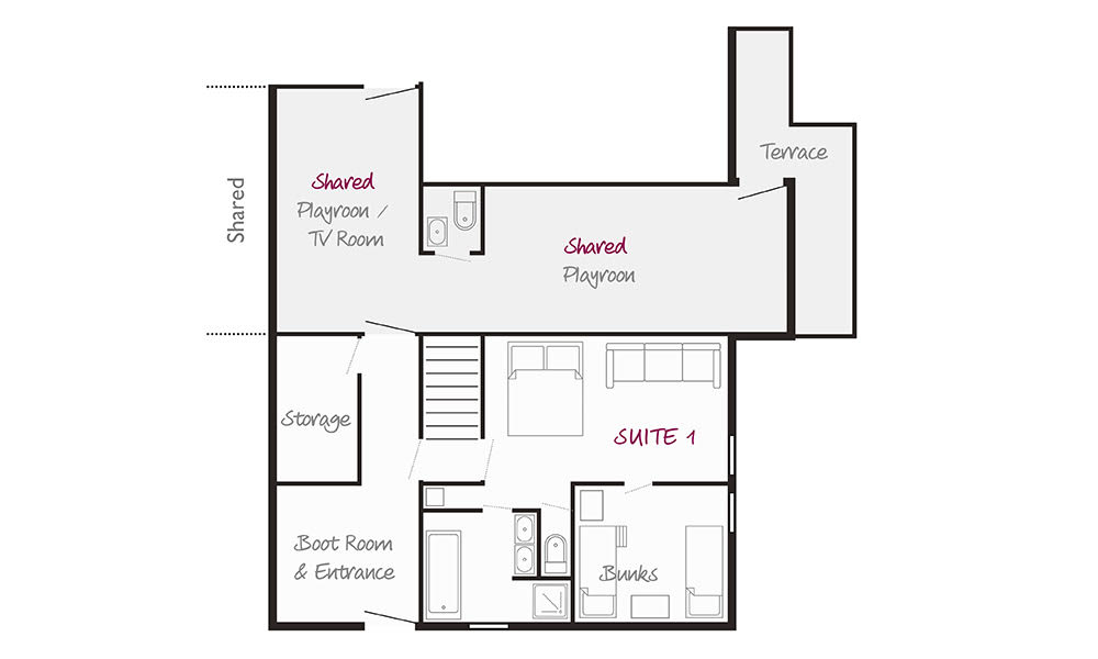 Our Katie chalets situated in a superb Les 3 Vallées location have always been extensively remodelled to suit the needs of families and this year is no exception. The two properties now offer families plenty of space, perfect for three families travelling together who want a chalet to themselves. Both Katie chalets have individual hot tubs on their own sunny terraces. Katie 1 and Katie 2 can be booked together for groups of up to 26 with a connecting corridor through the shared playroom.