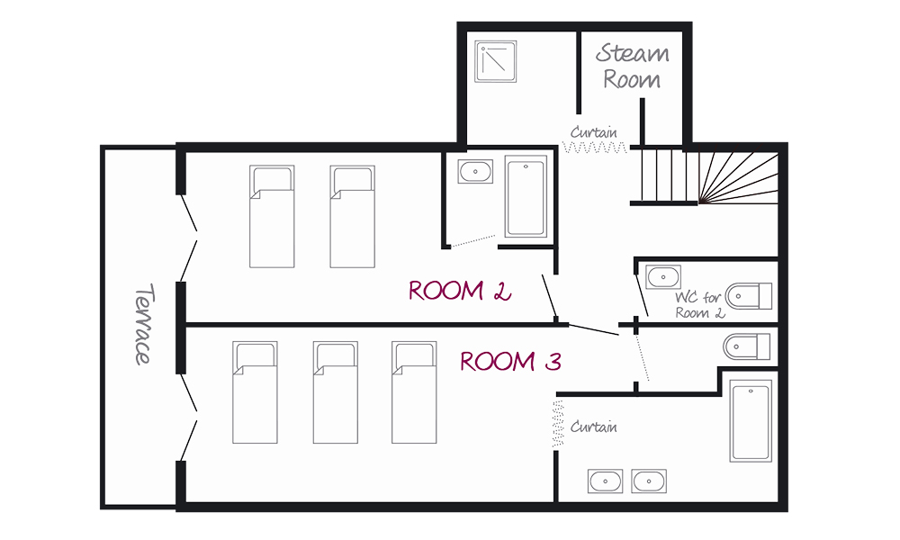 Sleeps 2 plus space for a cot. Twin / triple room with access to a south facing terrace. Ensuite bath and separate WC.