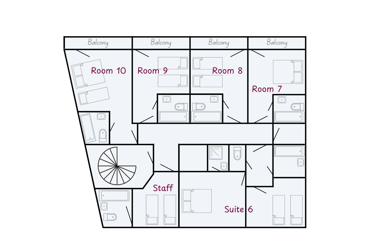 Sleeps 3. A triple room made up of 3 single beds with a private balcony and an ensuite bathroom with a toilet. Located on the First Floor.