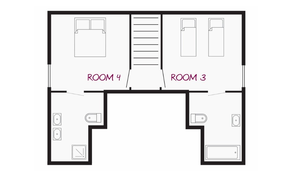Sleeps up to 2 plus space for a cot. This top floor room contains two single beds and a large ensuite with a bath/shower. This room can be booked with Room 4 to cater for families of four.