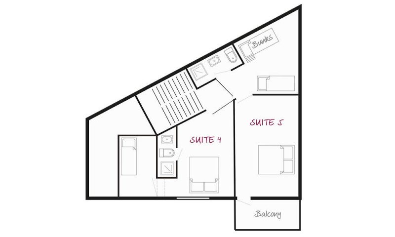 Sleeps 4 plus space for cot. This suite on the first floor has a twin room for children leading into a double room that has a wraparound balcony. The ensuite has a shower.